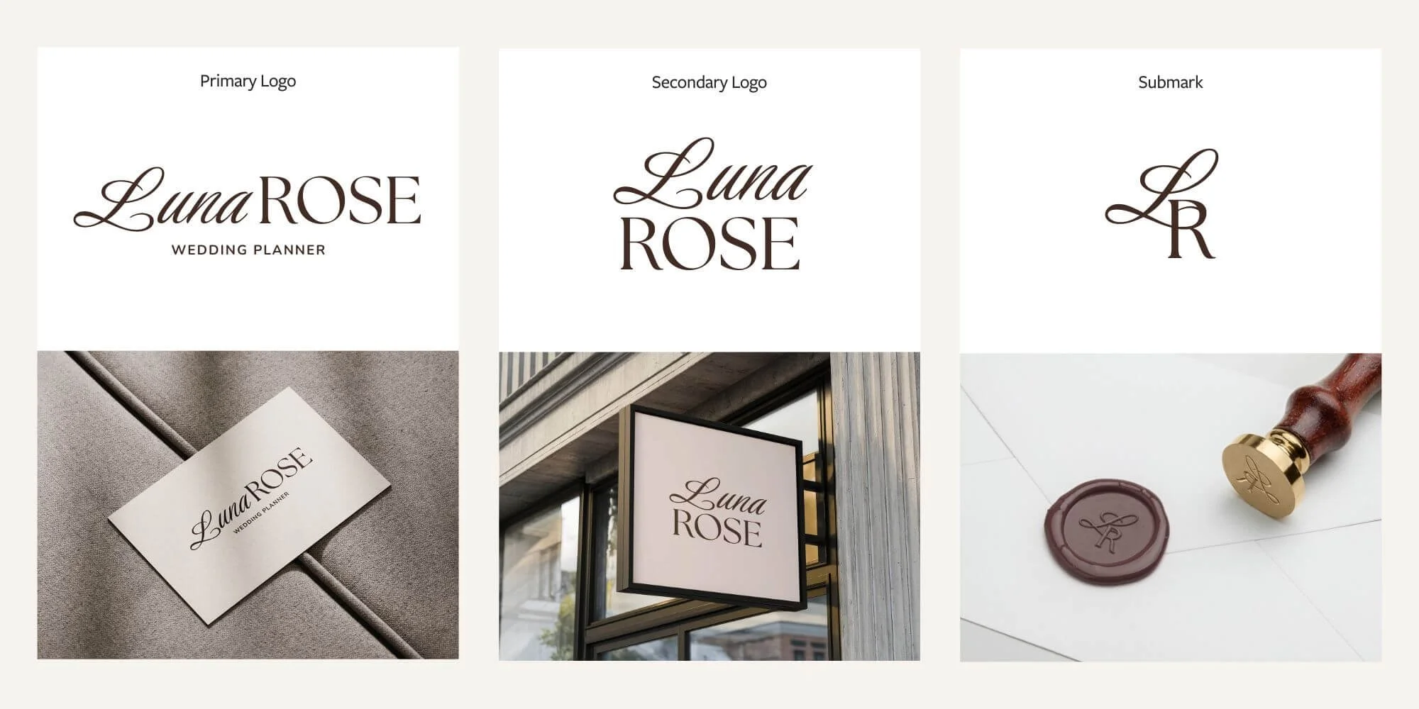 The image below is an example of the primary logo from my Luna Rose Brand Kit. You can see how this version of the logo is long and horizontal, including the tagline for a more complete layout - and how it translates beautifully when used on a business card.