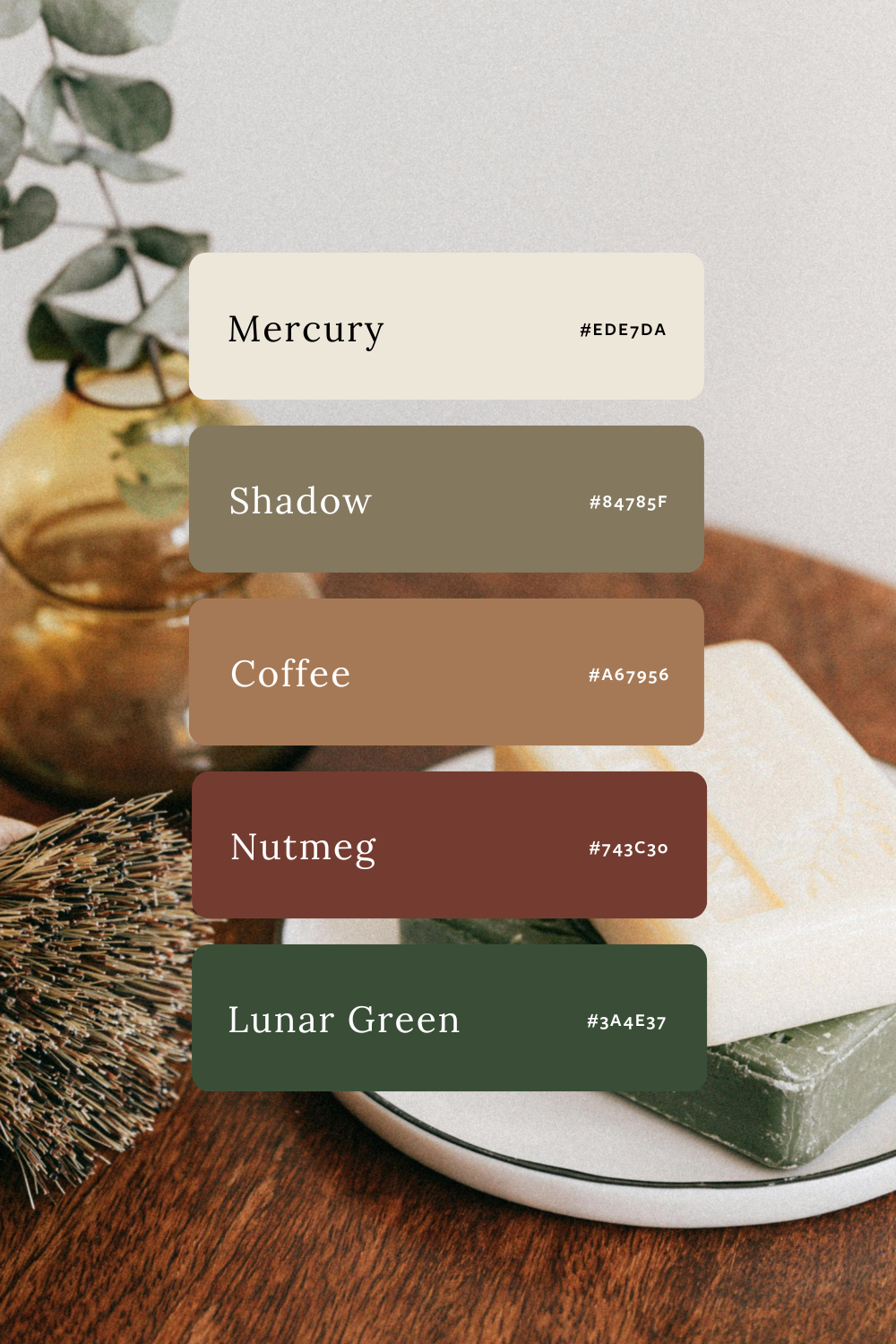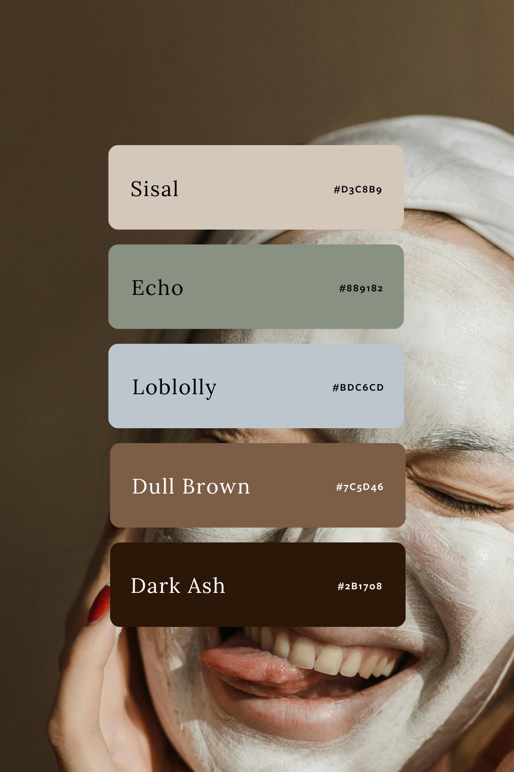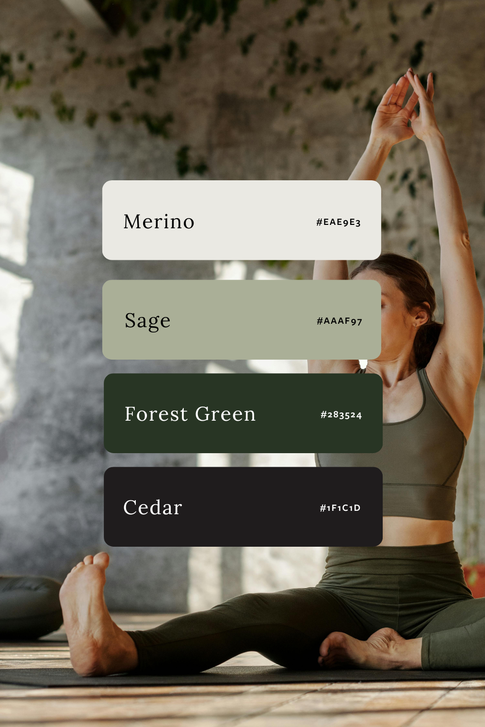 Soul Flow blends gentle neutrals with calming greens and deep grounding tones to create a palette that feels supportive, balanced, and emotionally warm. This palette is ideal if you want your brand to feel calming and natural without losing depth or professionalism.