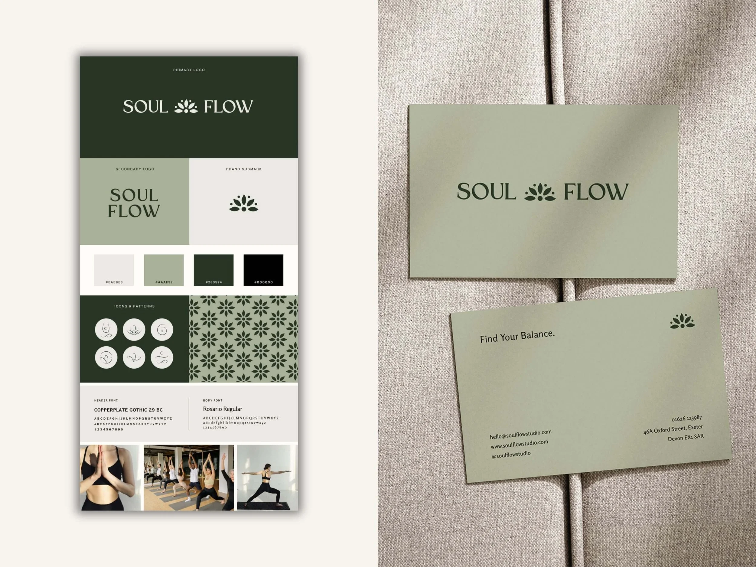 These colors are used throughout the Soul Flow Brand Kit, where the palette supports modern layouts and a calm, cohesive visual rhythm.